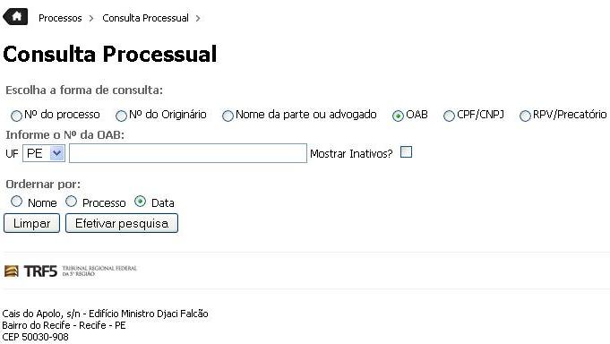 A pesquisa será realizada de acordo com a escolha da opção Nome da parte ou advogado,para pesquisar por Nome da parte ou advogado,basta escolher a opção Nome da parte ou advogado,posicionar o mouse no campo Nome da parte ou advogado e digitar seu Nome ou trecho do Nome o usuário poderá escolher a ordenação para a consulta as ordenações são.
